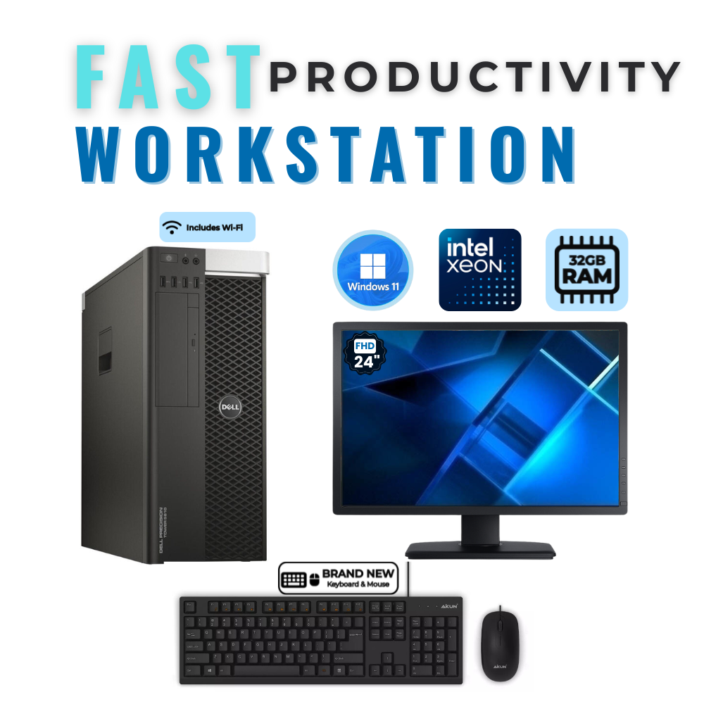 Dell Xeon Workstation Bundle 32GB RAM 256GB 1GB Graphics Windows 11 + 24" Monitor