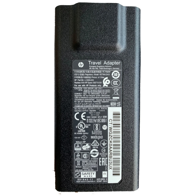 Bulk of 2x HP Slim Travel Adapter 65W, 19.5V Laptop Charger - Blue Tip, 4.5 x 3.0mm for HP Notebooks